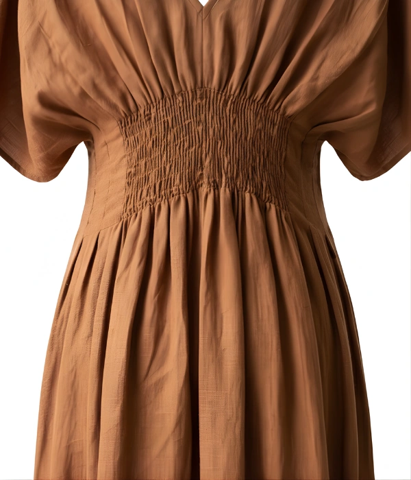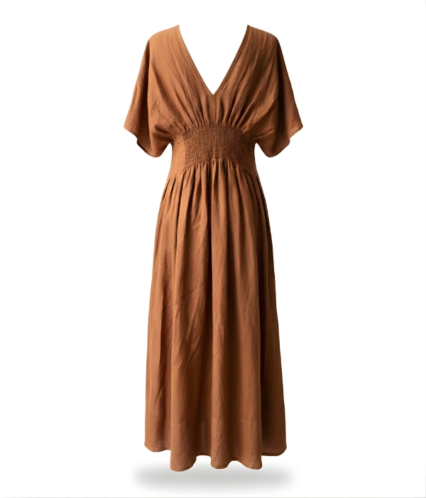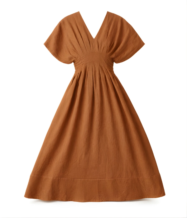 The Imani Dress features a v-neckline, kimono sleeves, pleated waist, rear smocking for comfort, hidden side pockets, and a deep hem—designed to feel composed yet effortless.