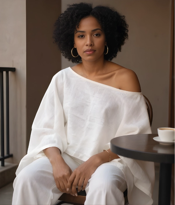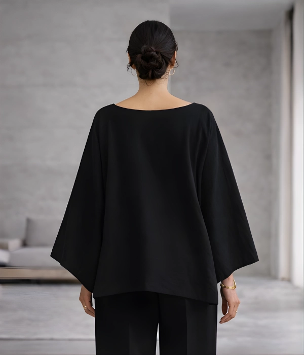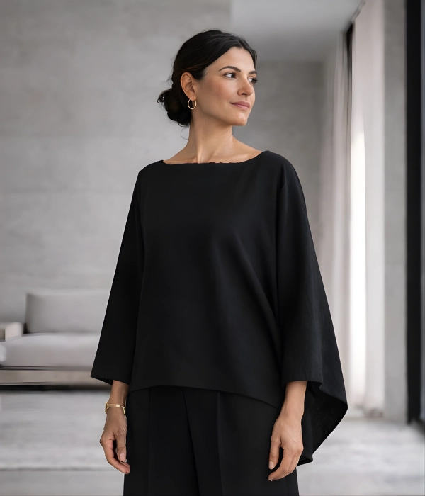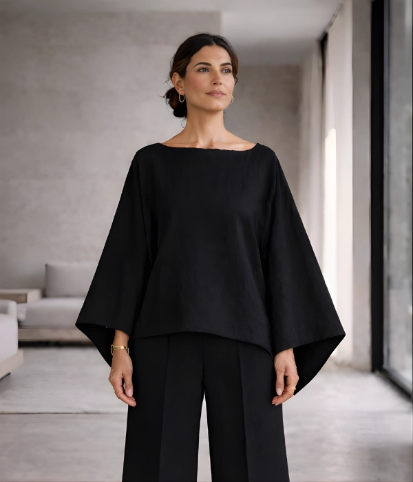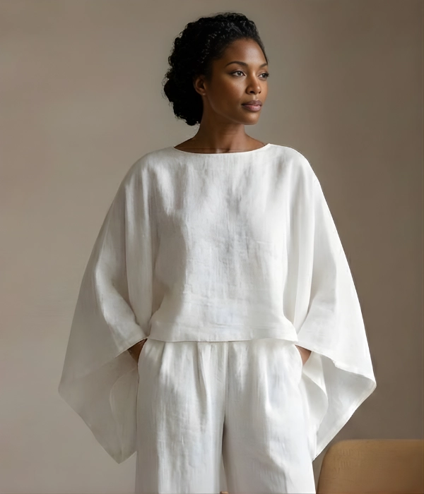 Lightweight linen with soft structure. Clean, intentional silhouette that skims the body. Widened boat neckline. Draped sleeves designed for ease and quiet presence. Hemmed to sit at the hip.