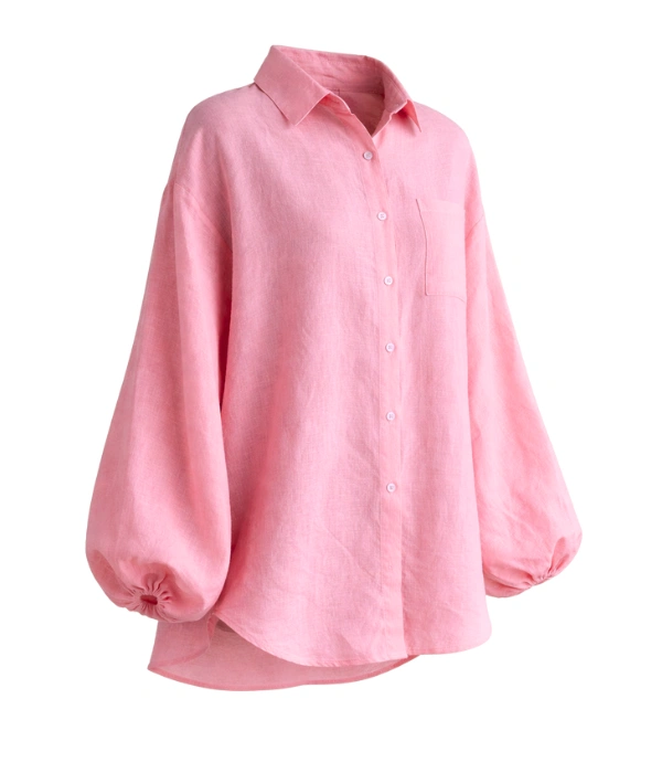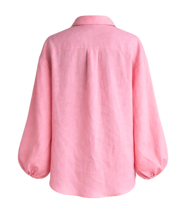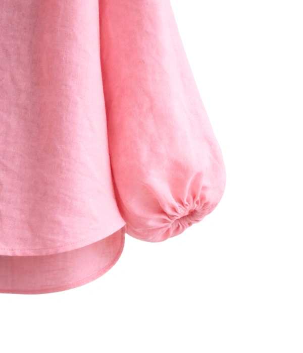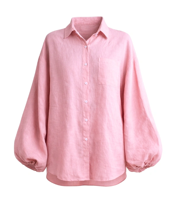 Lightweight linen with a breathable, lived-in feel. Oversized silhouette designed for ease and layering. Voluminous balloon sleeves add shape without stiffness. Button-front closure. Designed to be worn loose, open, or partially tucked.